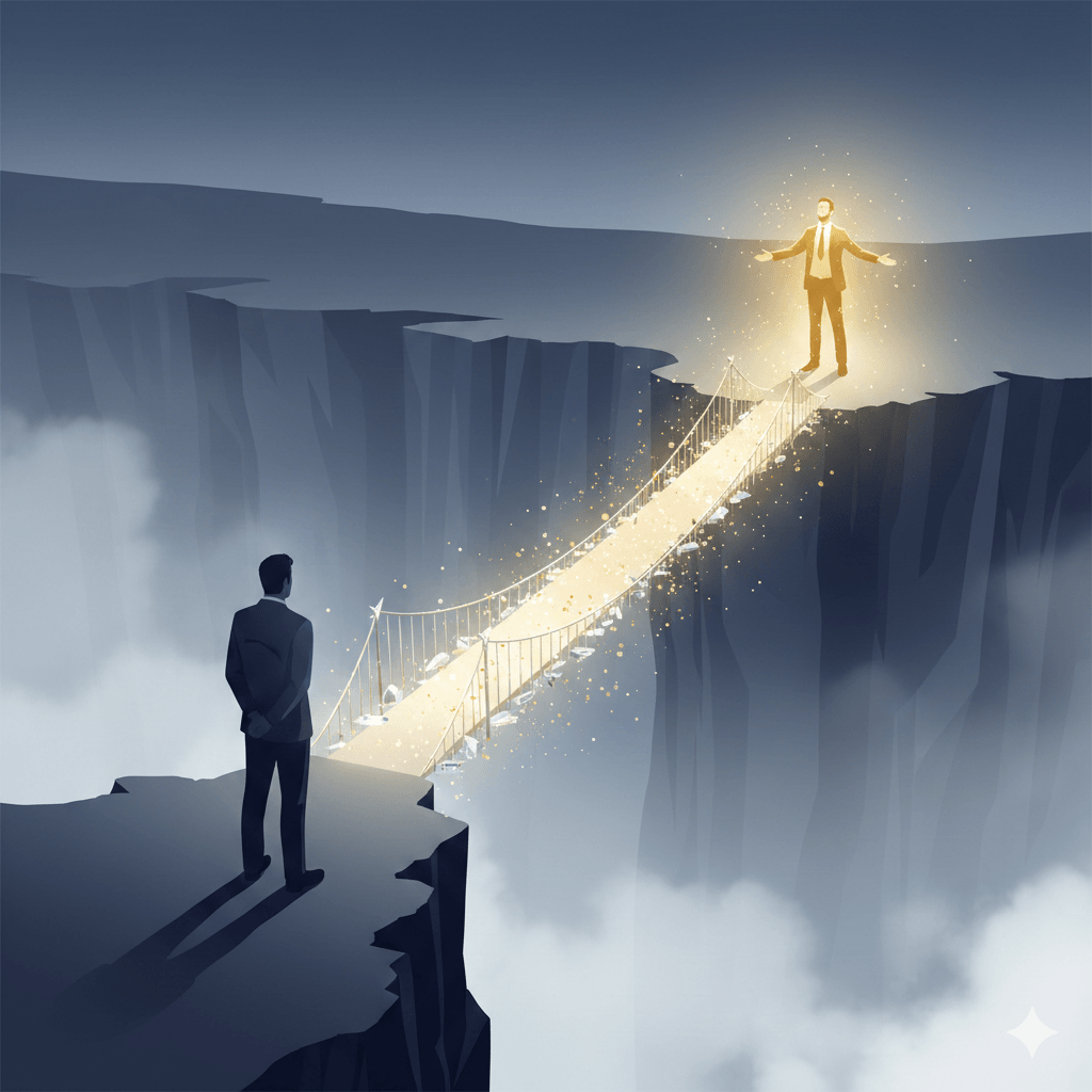 Lo que te paraliza no es lo externo. Es la brecha invisible y desgarradora entre el líder que has sido hasta ahora y el líder que este momento crucial exige que te conviertas. Tu proyecto no está estancado por falta de un plan. Tú estás en la orilla de tu propio salto evolutivo.
